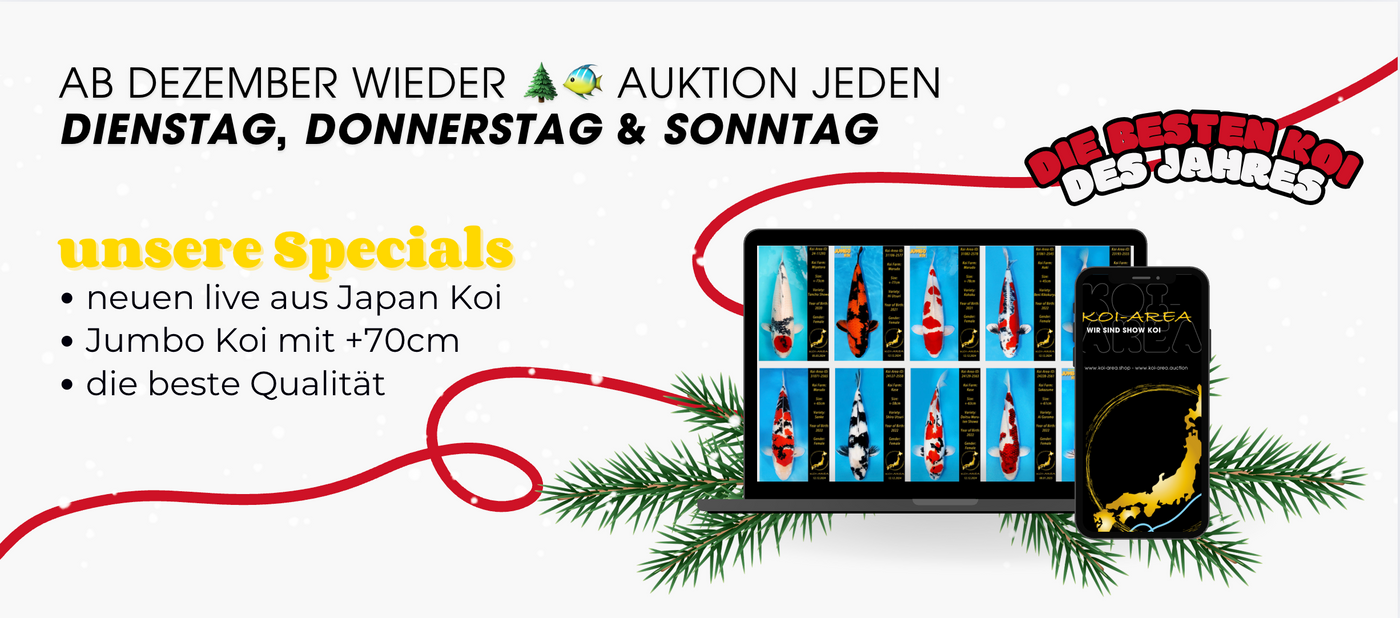 Willkommen bei Koi-Area! Bei uns findest du eine sorgfältige Auswahl an erstklassigen Koi, die aus den besten Zuchten stammen. Unsere Koi zeichnen sich durch ihre Gesundheit und Schönheit aus, perfekt für deinen Teich. Egal, ob du ein Anfänger oder ein erfahrener Teichbesitzer bist – bei uns findest du den idealen Koi für dein Teichprojekt. Koi kaufen leicht gemacht – wir bieten dir nicht nur erstklassige Fische, sondern auch wertvolle Tipps zur Pflege.