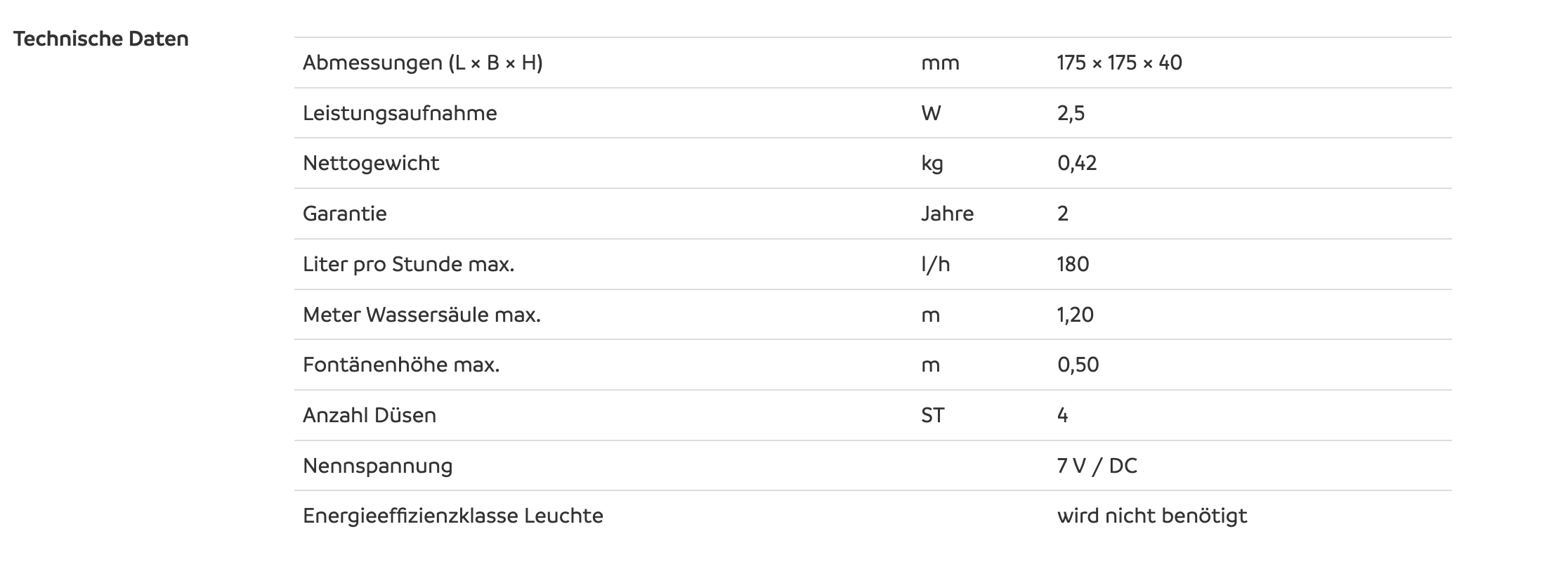 | Fontänenhöhe max. | m | 0,50 |