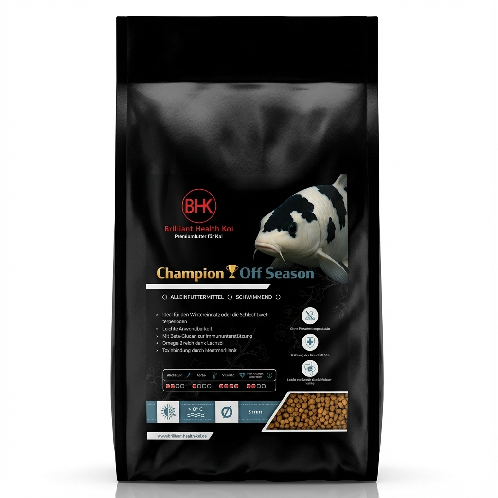 BHK Champion Off Season ist ein schwimmendes Premium Koifutter für die Übergangszeit sowie milde Winterphasen. Es wurde speziell für Temperaturen ab ca. 8 °C entwickelt und unterstützt Koi dabei, auch bei kühlerem Wasser aktiv, vital und widerstandsfähig zu bleiben. Die ausgewogene Rezeptur liefert gezielt Energie, ohne den Stoffwechsel unnötig zu belasten. Durch die schwimmenden Pellets können die Koi stressfrei an der Wasseroberfläche fressen.
