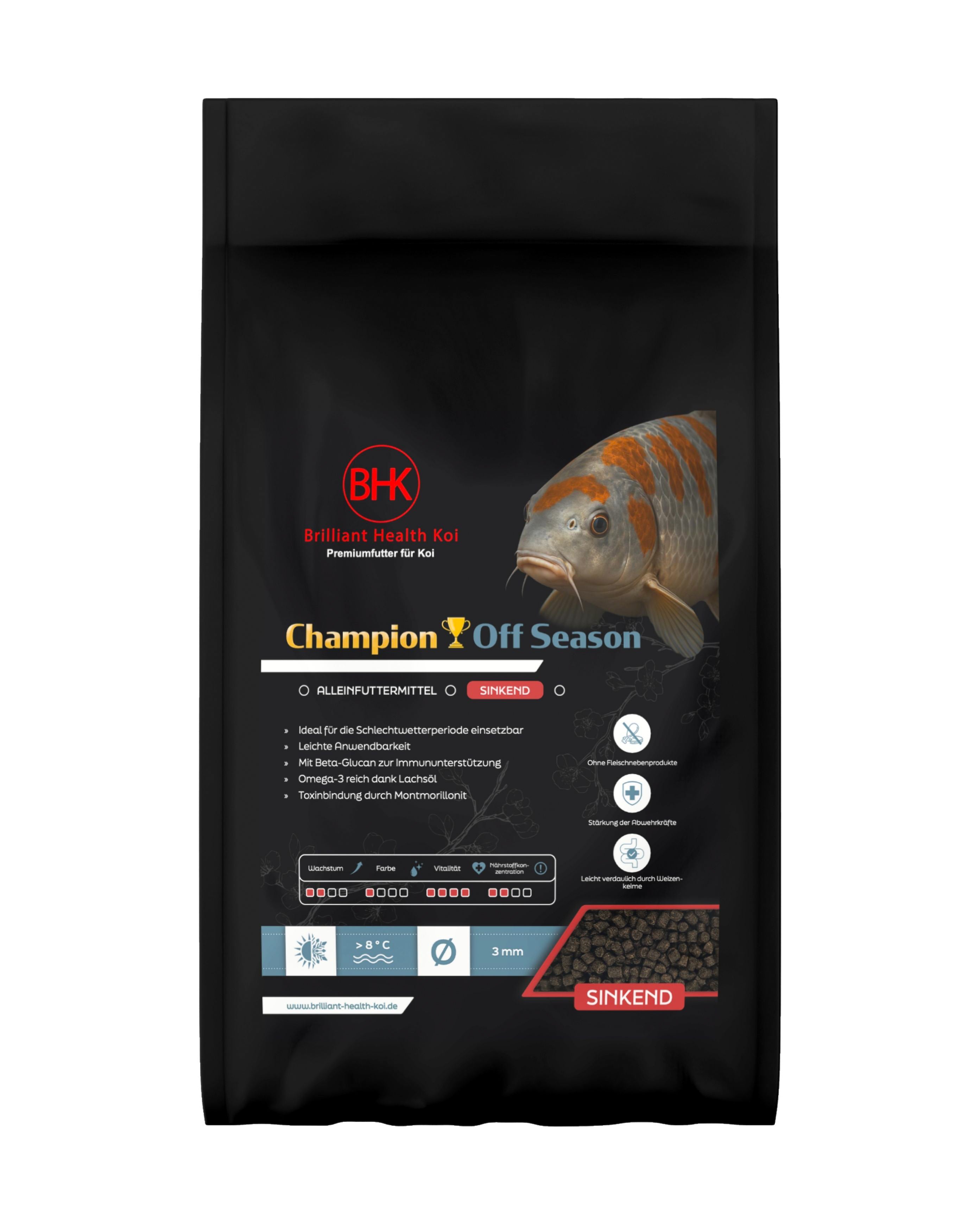 BHK Champion Off Season – sinkendes Koifutter für Übergangszeit & Winter - 4.5mm / 1.2kg wird bei Bestellung nachbestellt. Lieferzeit beträgt ca. 10-14 Werktage.