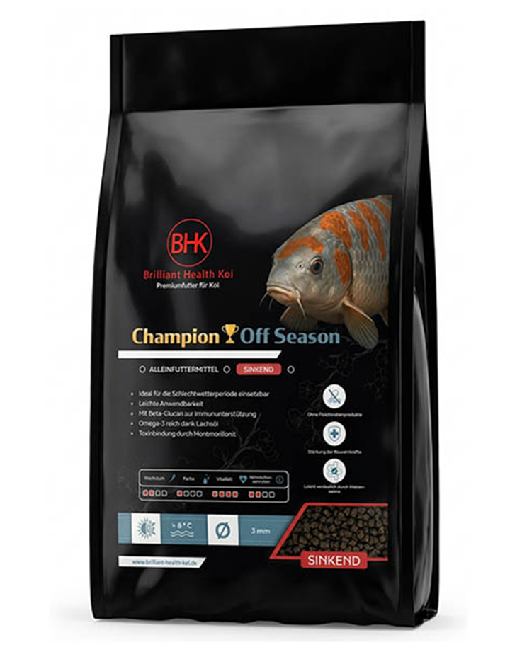 BHK Champion Off Season sinkend ist ein sinkendes Premium Koifutter für die Übergangszeit sowie milde Winterphasen. Es wurde speziell für Temperaturen ab ca. 8 °C entwickelt und eignet sich ideal für Koi, die bevorzugt in tieferen Wasserschichten fressen. Die ausgewogene Rezeptur liefert gezielt Energie, ohne den Stoffwechsel unnötig zu belasten, und unterstützt die Vitalität sowie Widerstandskraft der Koi auch bei kühlerem Wasser.