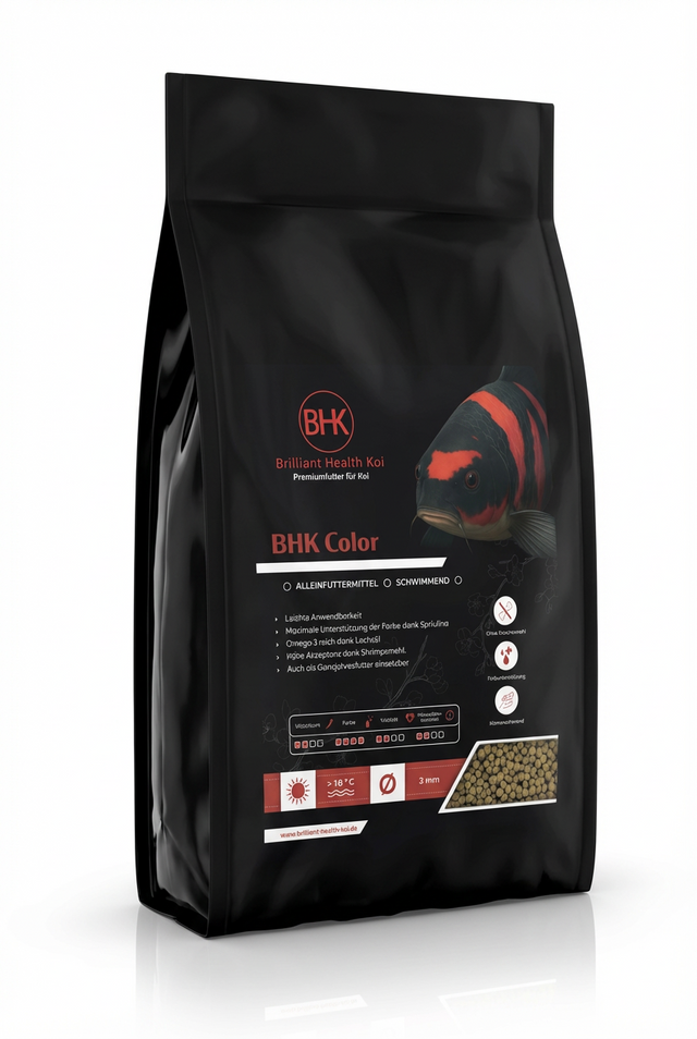 BHK Daily Color swimming ist ein schwimmendes Farbfutter für Koi zur gezielten Unterstützung der natürlichen Farbintensität. Spirulina und Lachsöl fördern kräftige Rot-, Weiß- und Schwarztöne und versorgen die Koi mit wichtigen Nährstoffen für Vitalität und Wachstum.