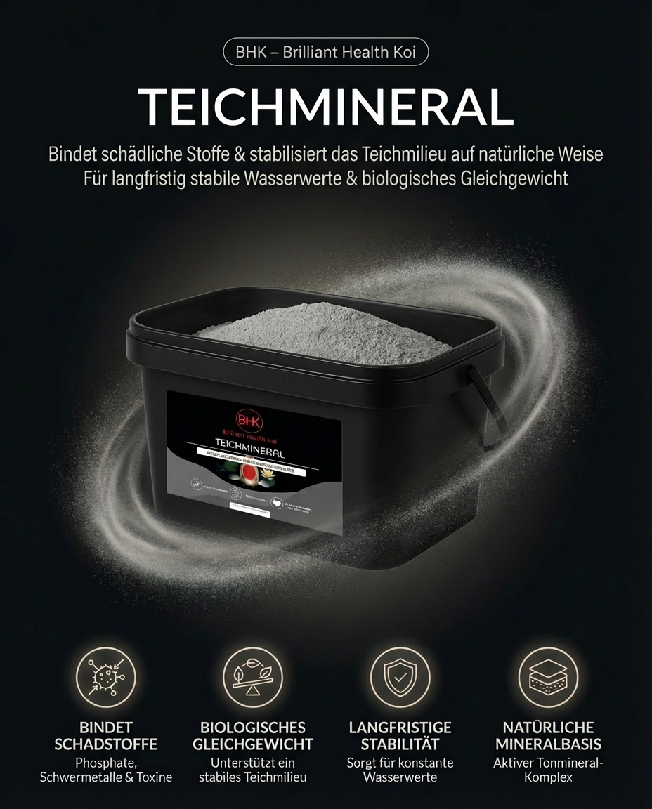 BHK Teichmineral ist ein fein vermahlener, aktivierter Tonmineral-Komplex zur natürlichen Wasserklärung im Teich. Es bindet schädliche Stoffe wie Phosphate, Schwermetalle und Toxine dauerhaft in seiner Mineralstruktur und unterstützt so ein stabiles, gesundes Teichmilieu.